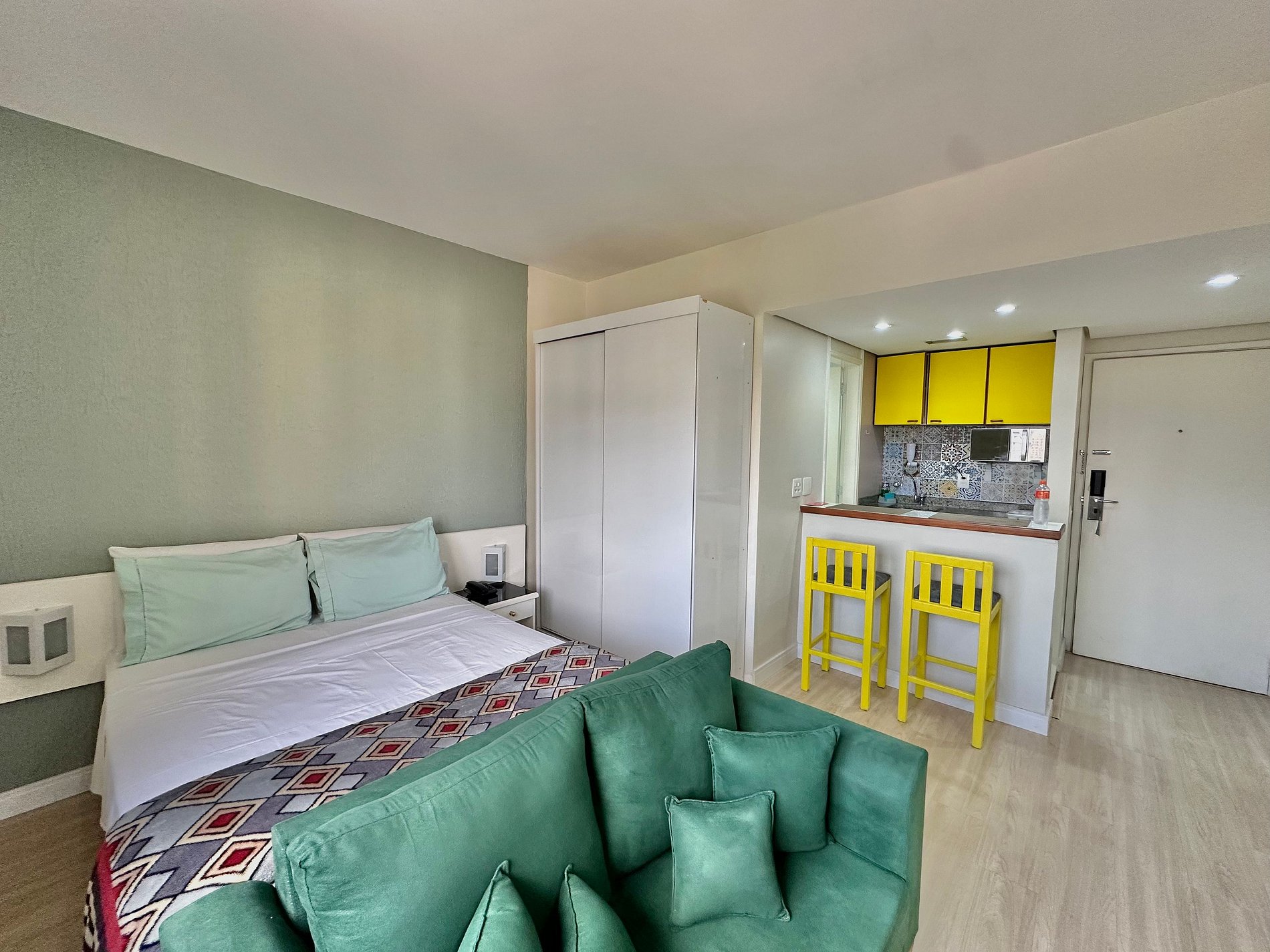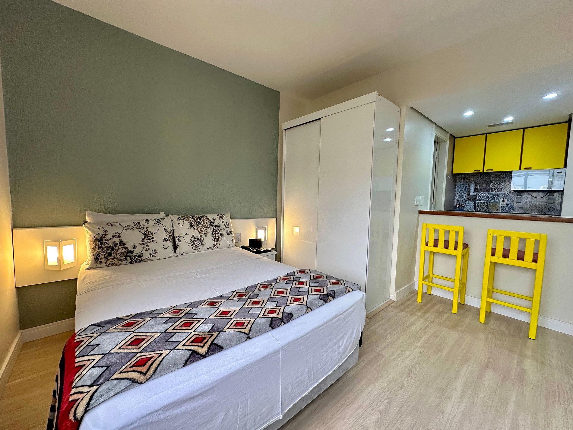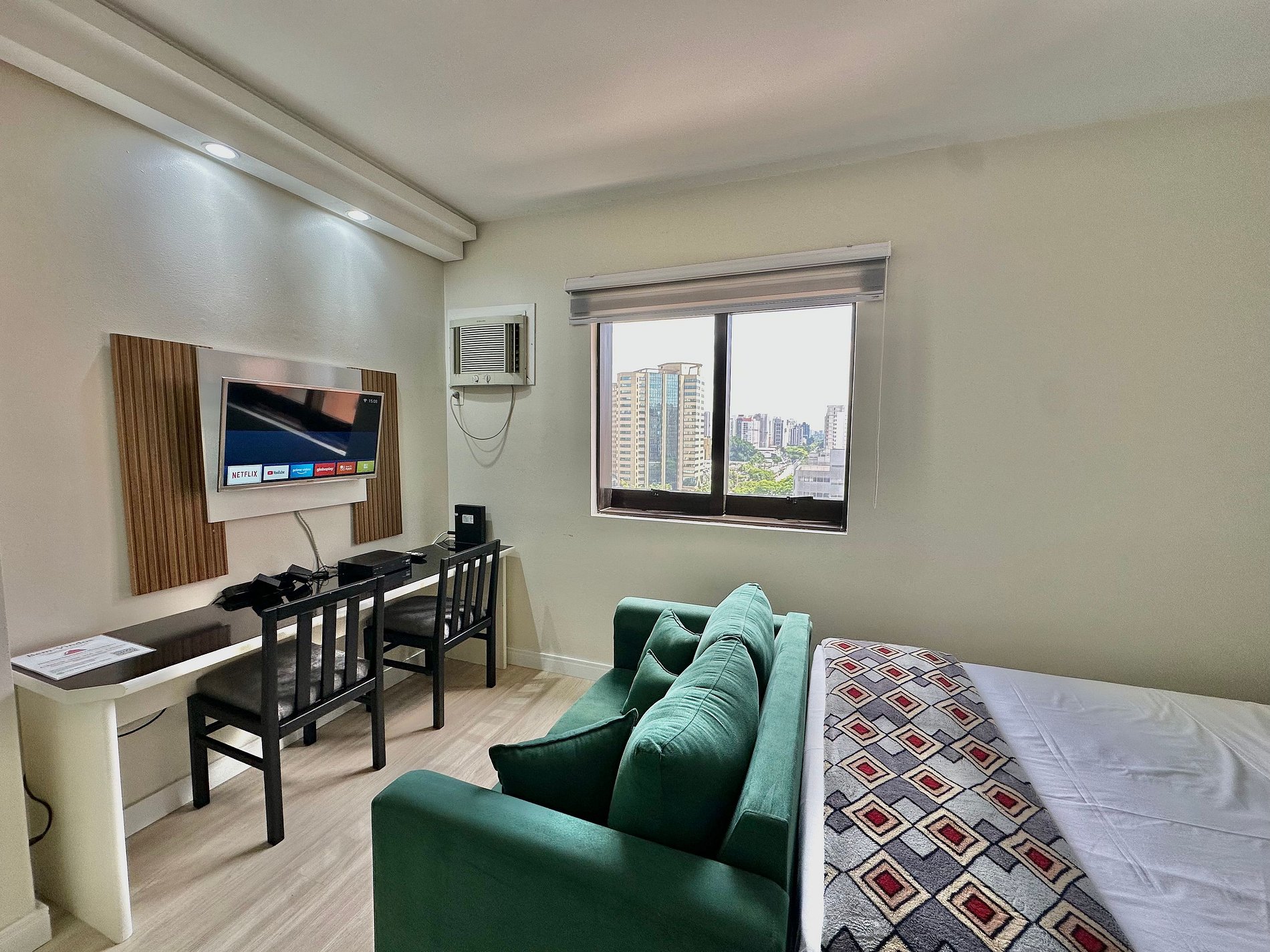 Espaço confortável c/ TV Smart, Internet banda larga, ar condicionado e cozinha compacta.