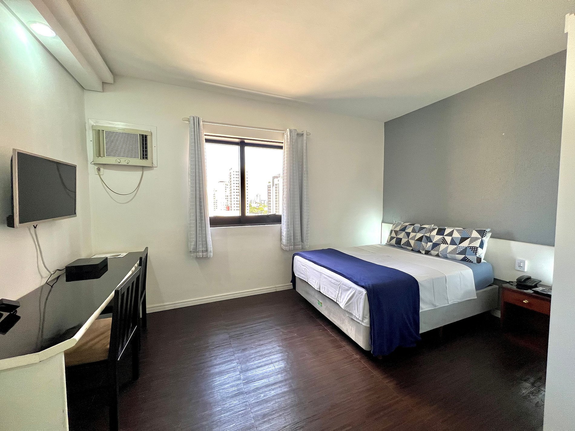 Espaço confortável c/ TV Smart, Internet banda larga, ar condicionado e cozinha compacta.