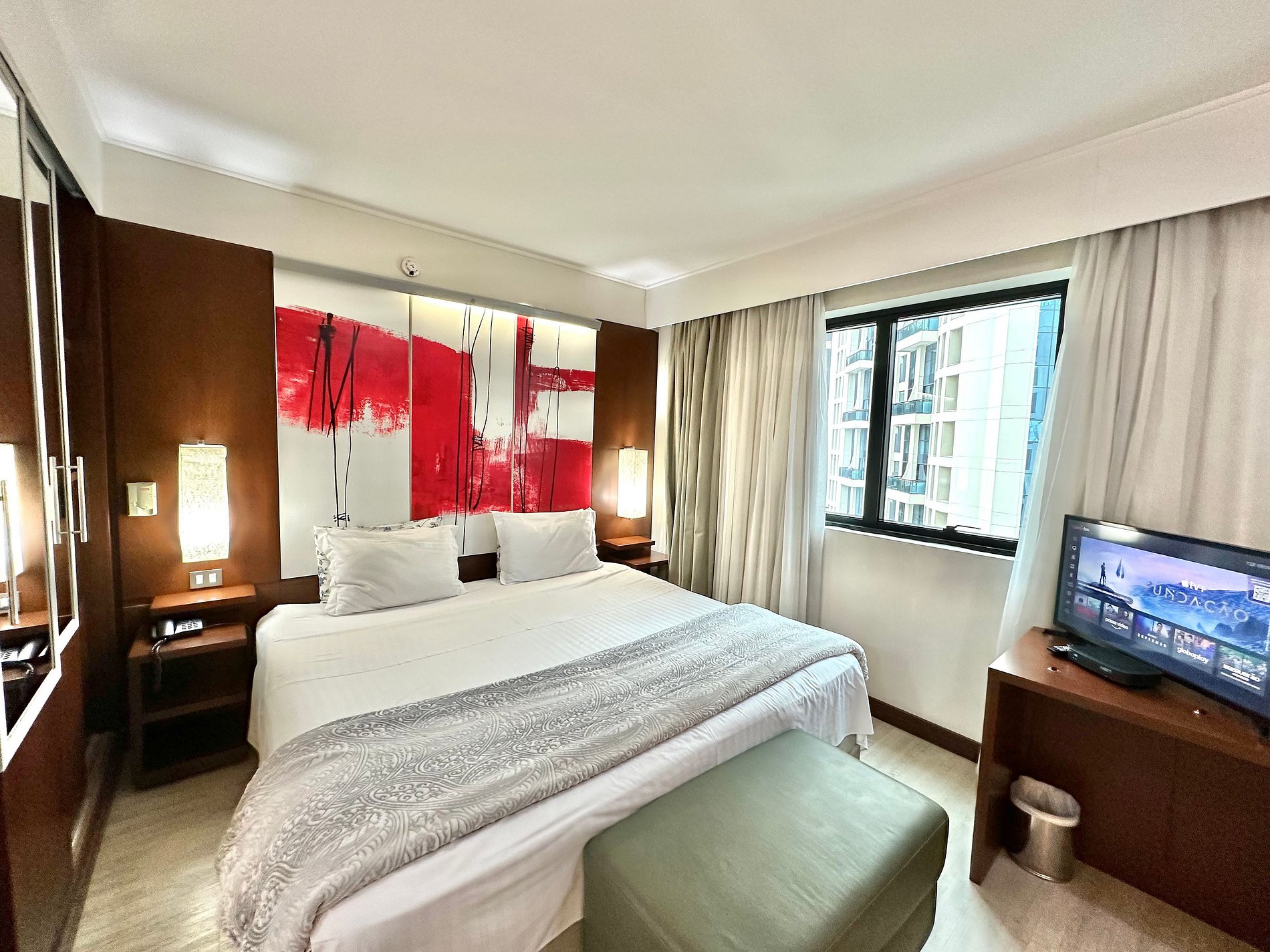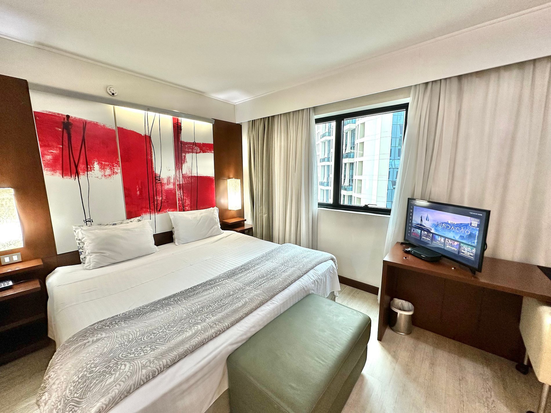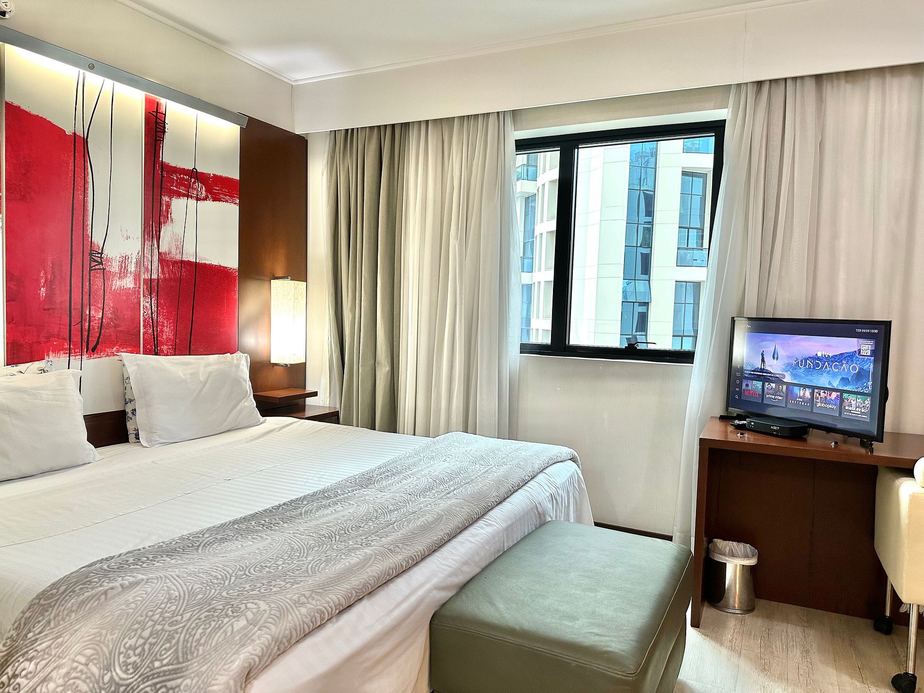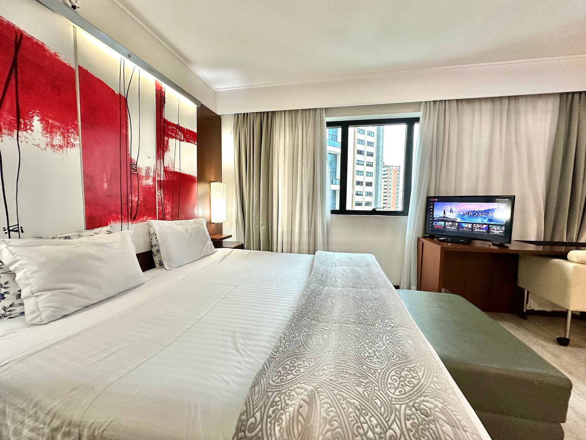 Cama Casal King, 04 travesseiros, enxoval de cama e banho, TV SMART, internet, frigobar, ar condicionado central, sofá 02 lugares, poltrona, mesa de trabalho, janelas amplas, mini cozinha c/ microondas, cafeteira expresso, talheres, arrumação diária, manobrista e mensageiro.