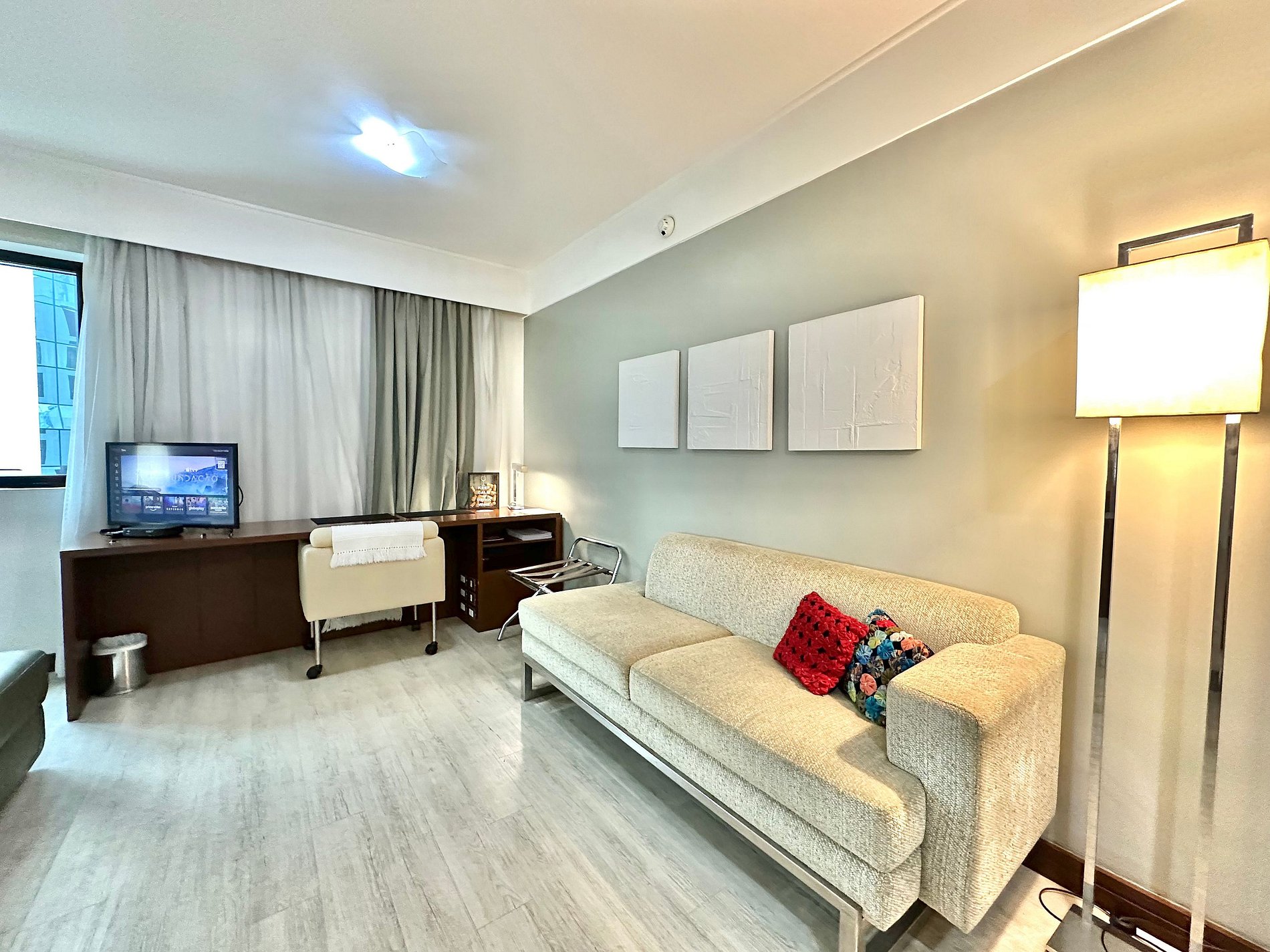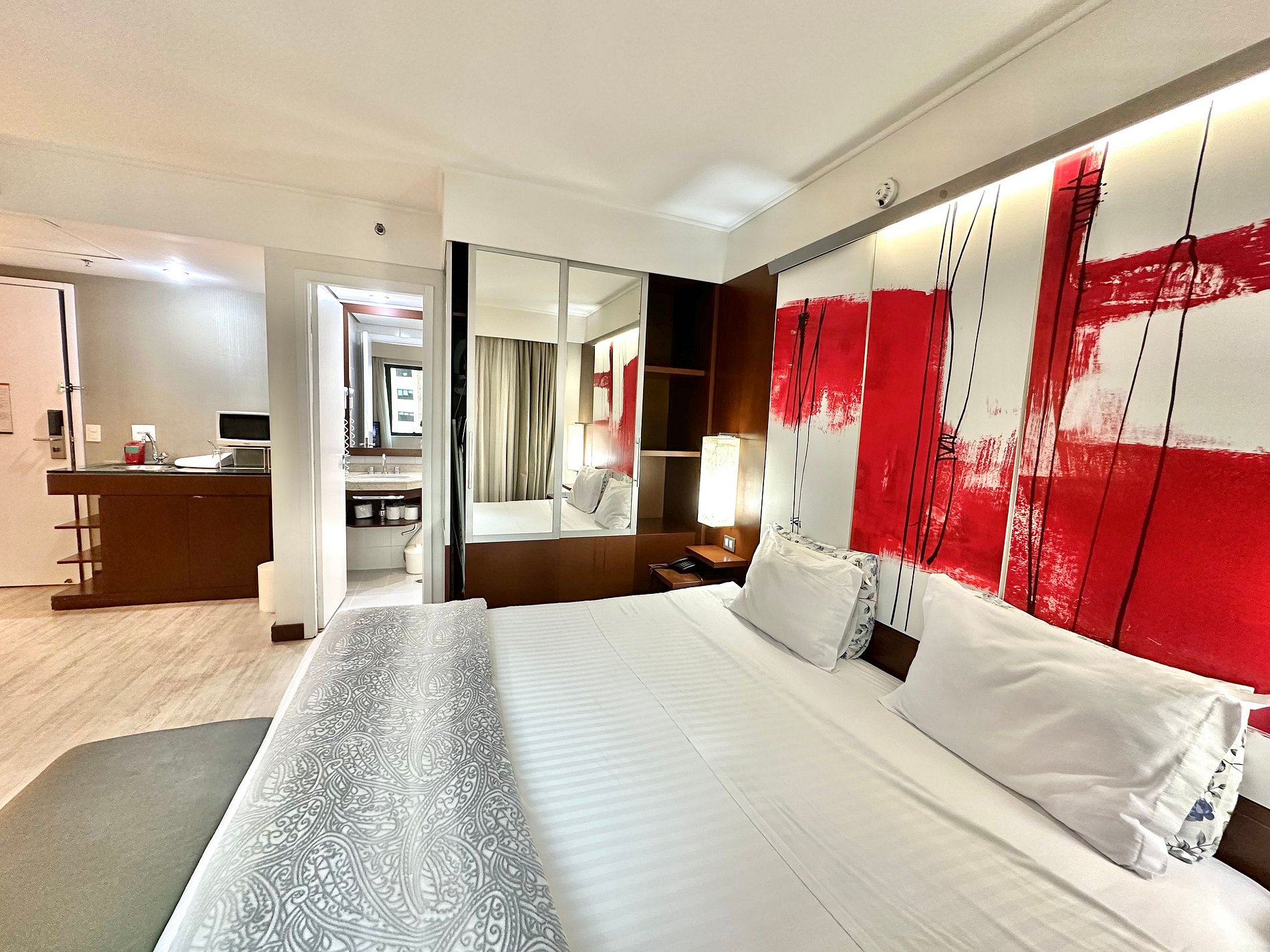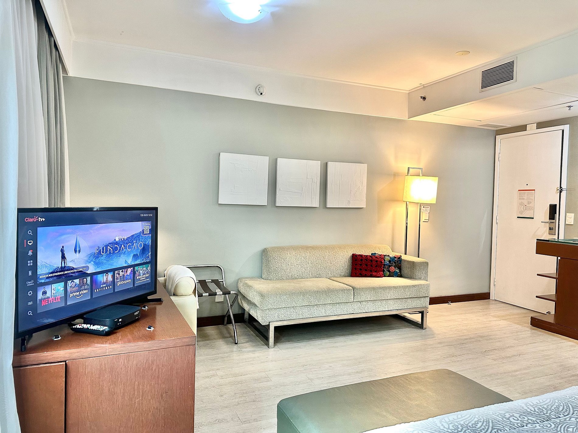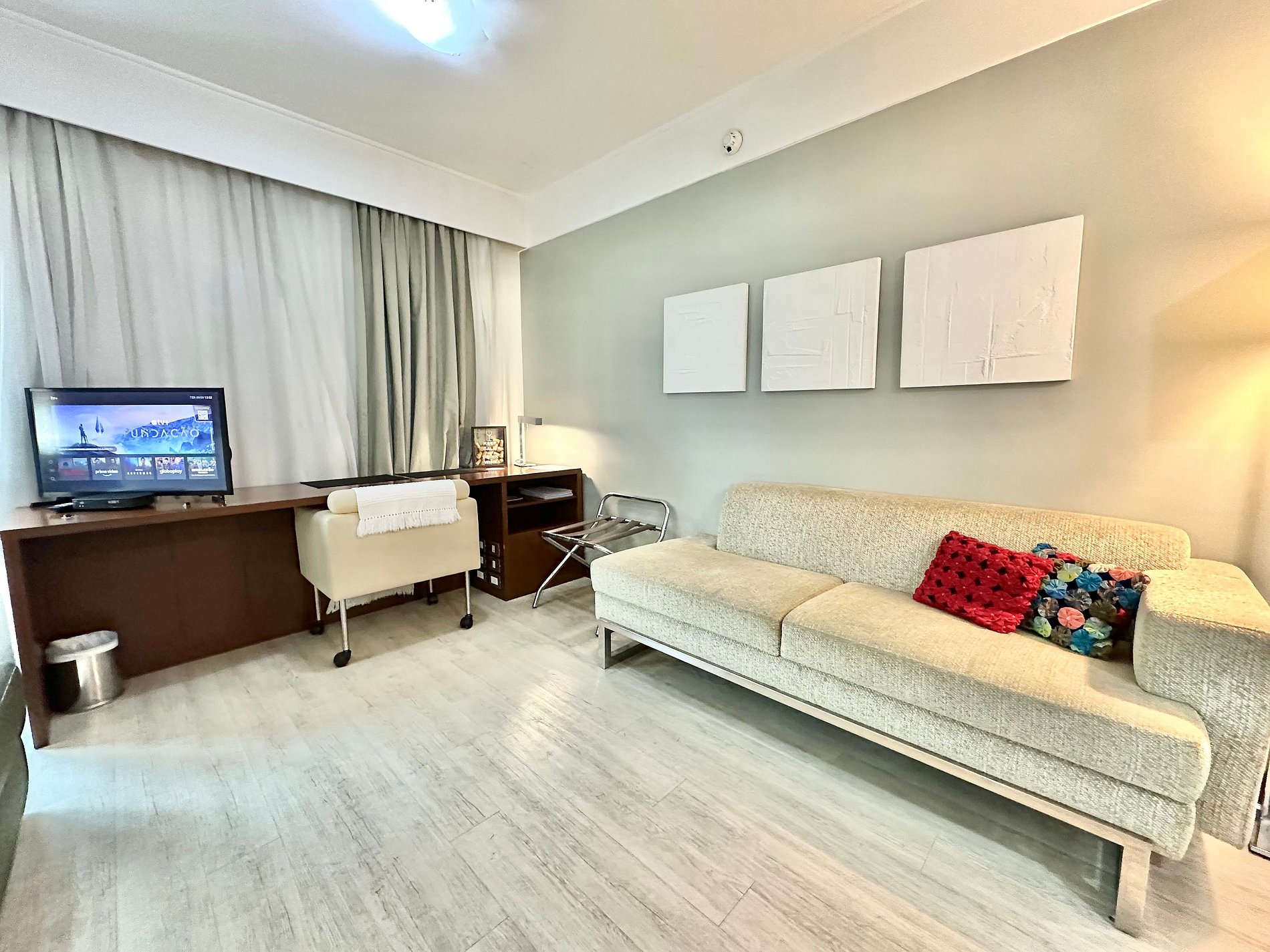 Cama Casal King, 04 travesseiros, enxoval de cama e banho, TV SMART, internet, frigobar, ar condicionado central, sofá 02 lugares, poltrona, mesa de trabalho, janelas amplas, mini cozinha c/ microondas, cafeteira expresso, talheres, arrumação diária, manobrista e mensageiro.