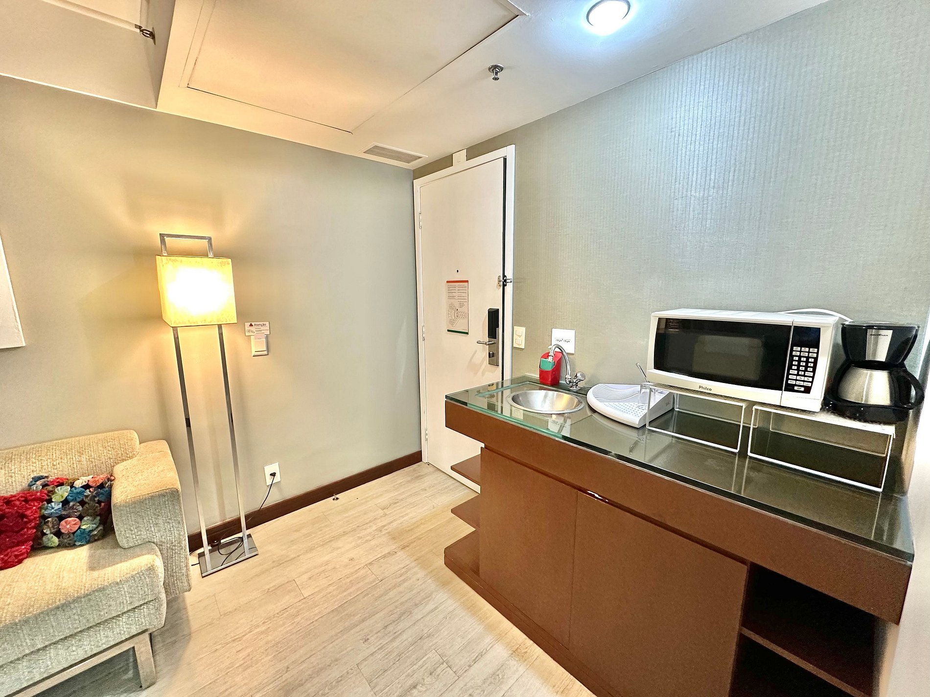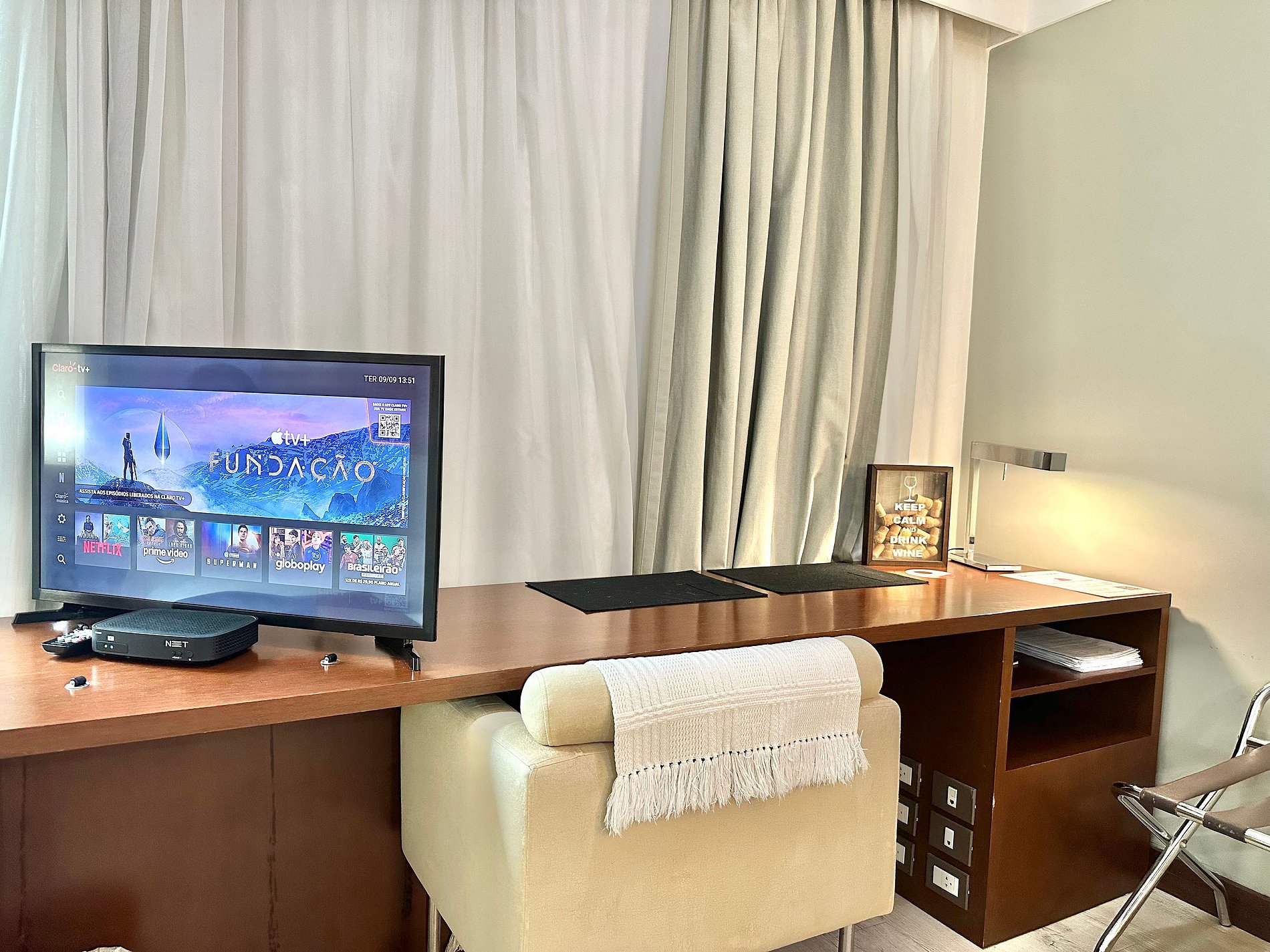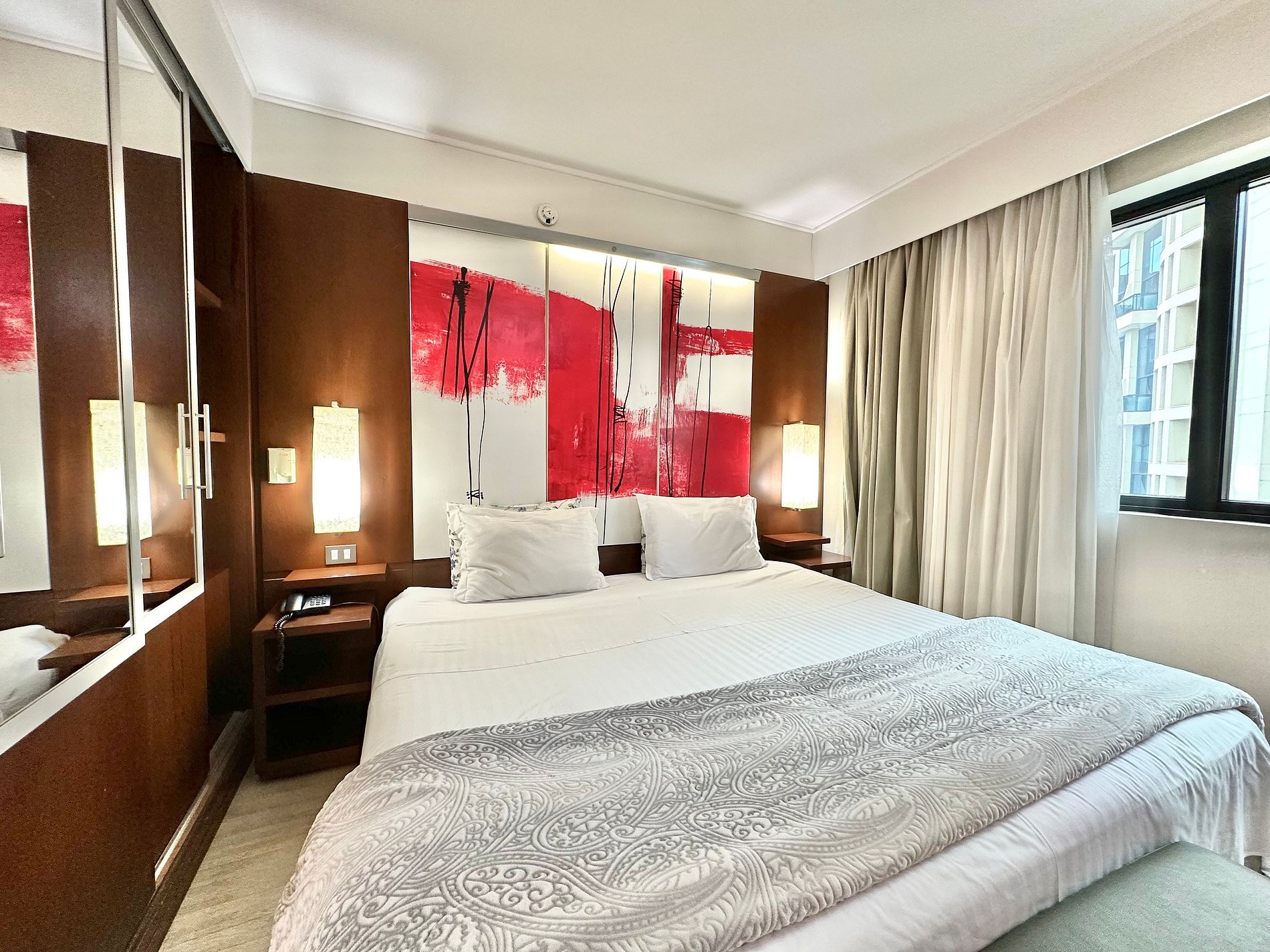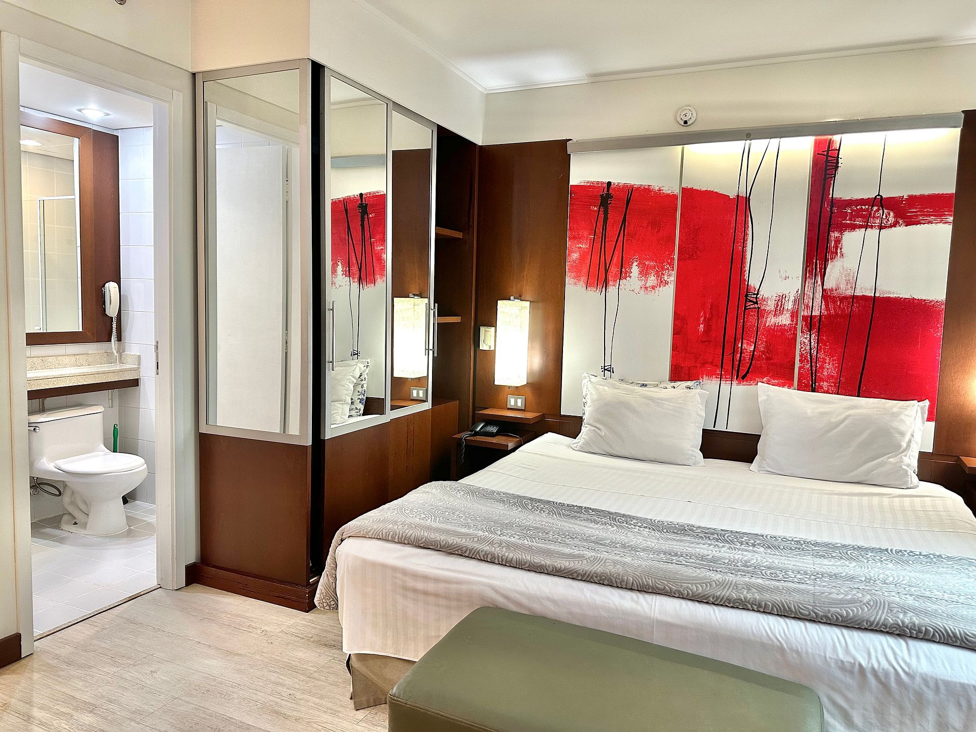 Cama Casal King, 04 travesseiros, enxoval de cama e banho, TV SMART, internet, frigobar, ar condicionado central, sofá 02 lugares, poltrona, mesa de trabalho, janelas amplas, mini cozinha c/ microondas, cafeteira expresso, talheres, arrumação diária, manobrista e mensageiro.