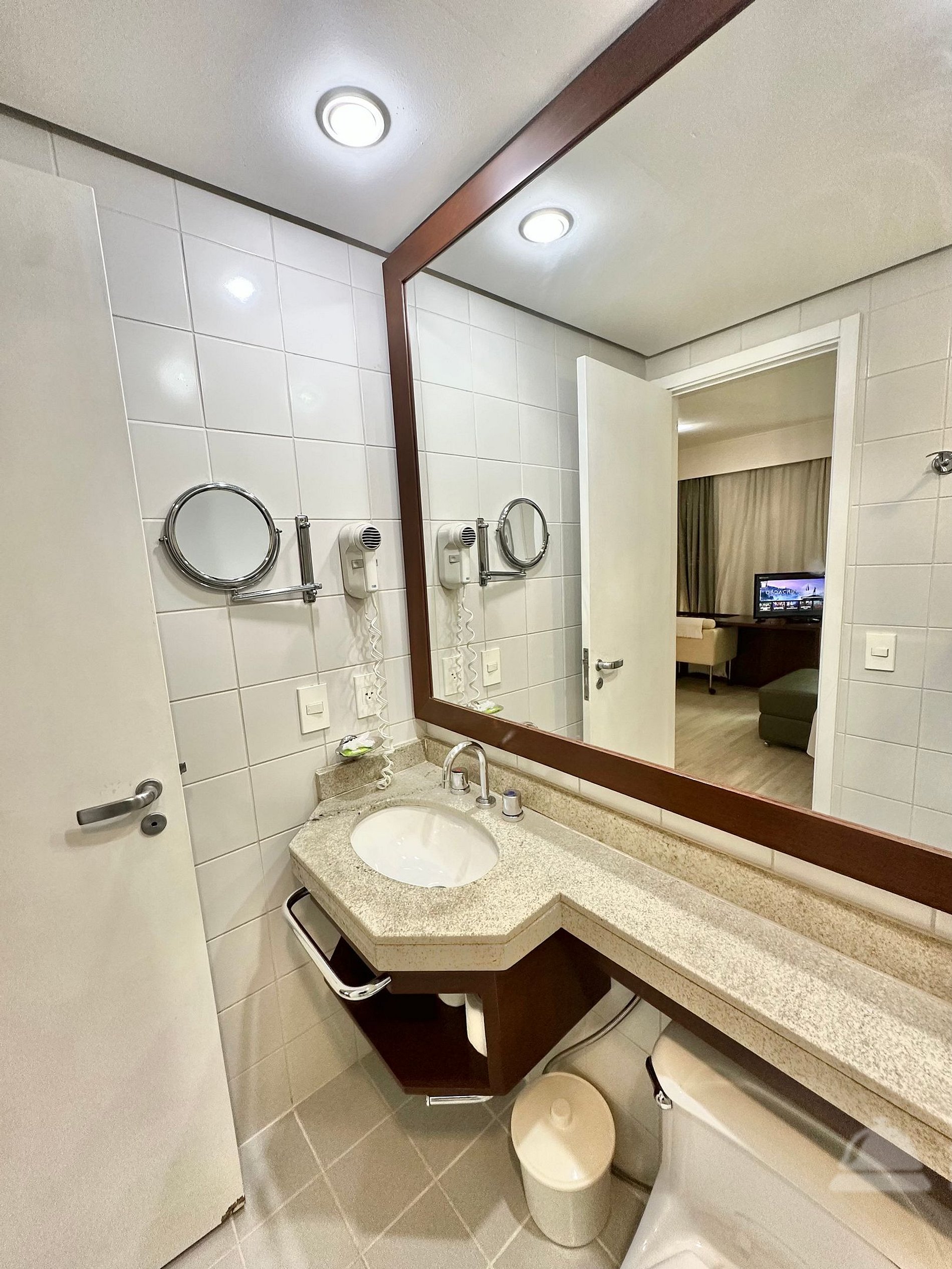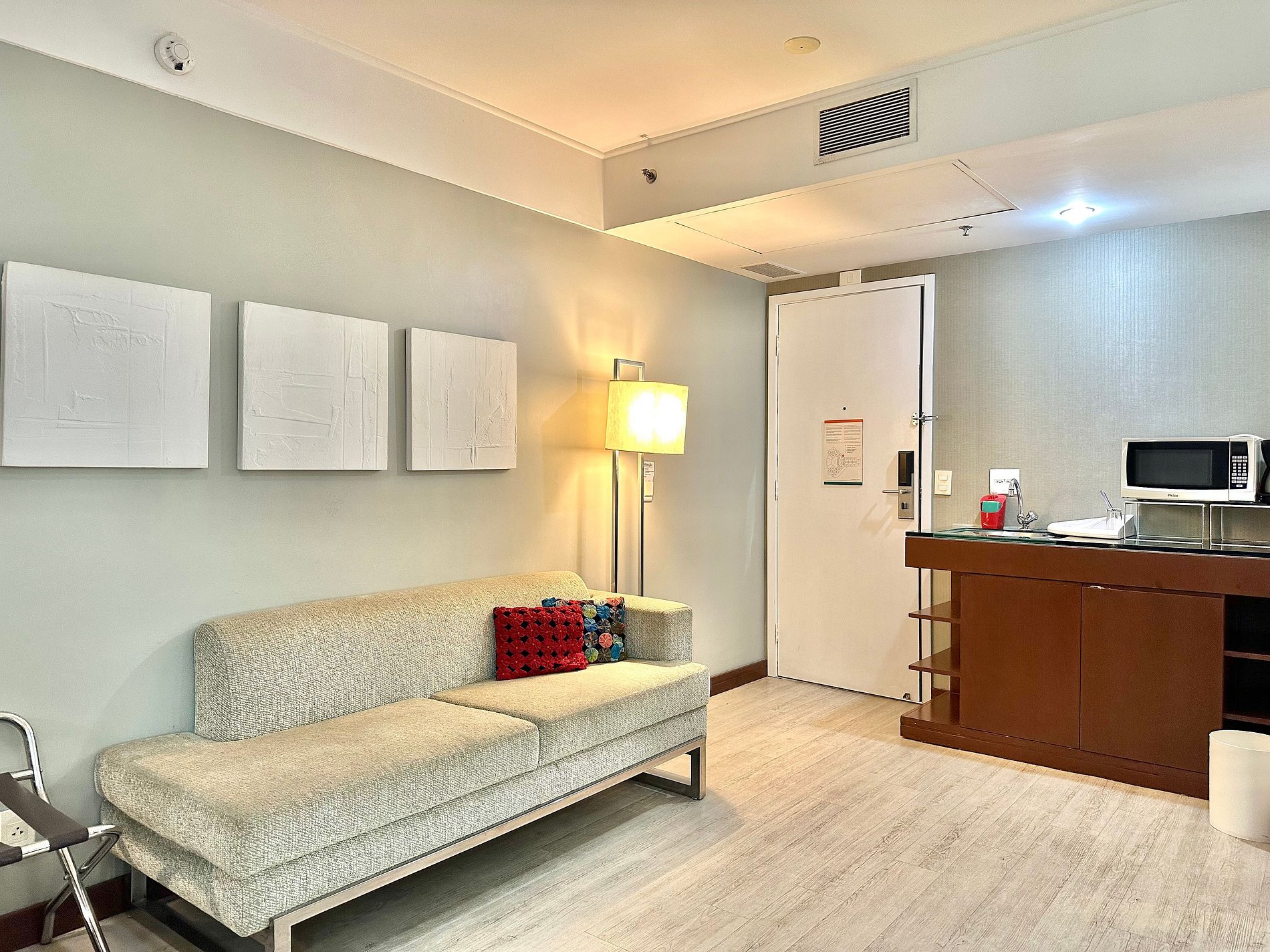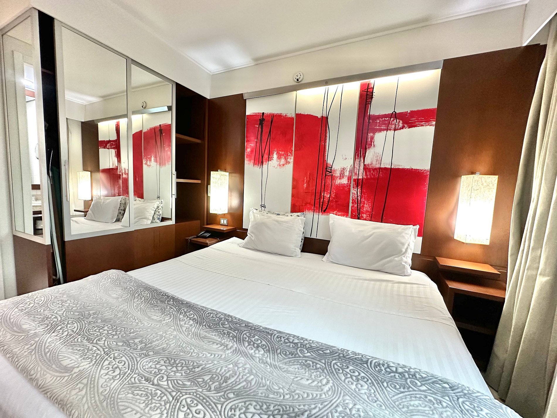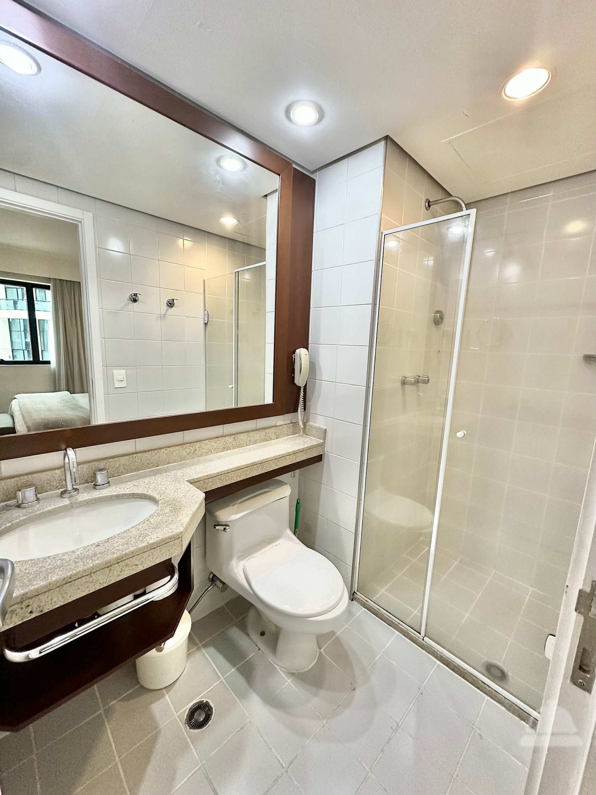 Cama Casal King, 04 travesseiros, enxoval de cama e banho, TV SMART, internet, frigobar, ar condicionado central, sofá 02 lugares, poltrona, mesa de trabalho, janelas amplas, mini cozinha c/ microondas, cafeteira expresso, talheres, arrumação diária, manobrista e mensageiro.