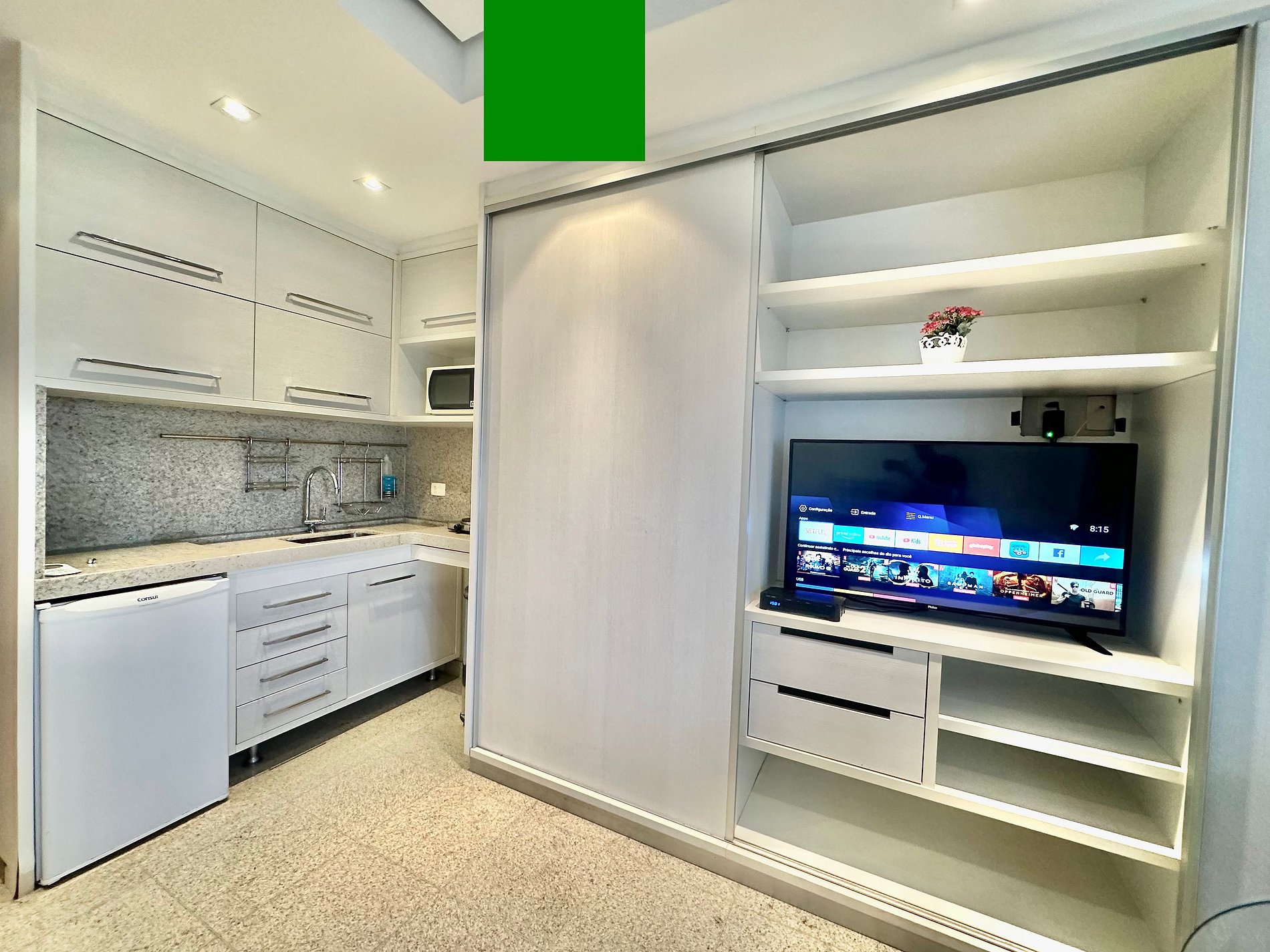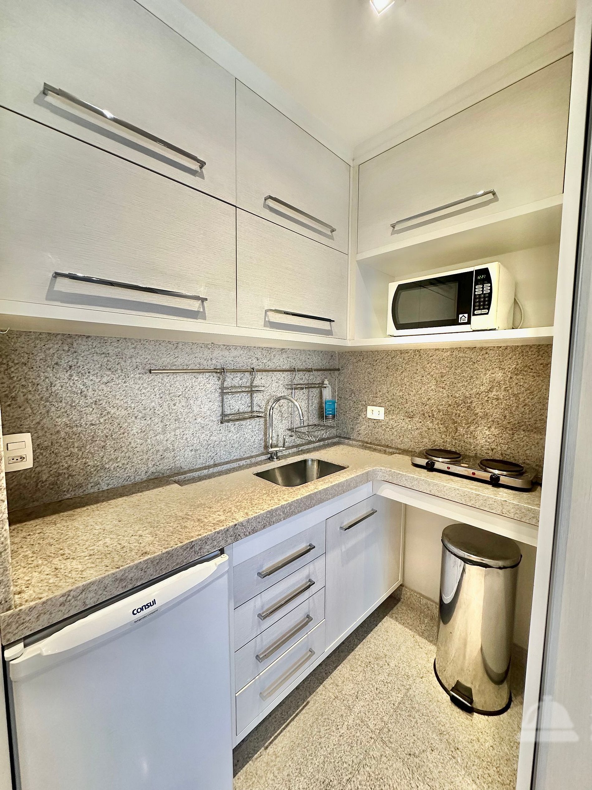 *Cozinha compacta com fogão elétrico e utensílios