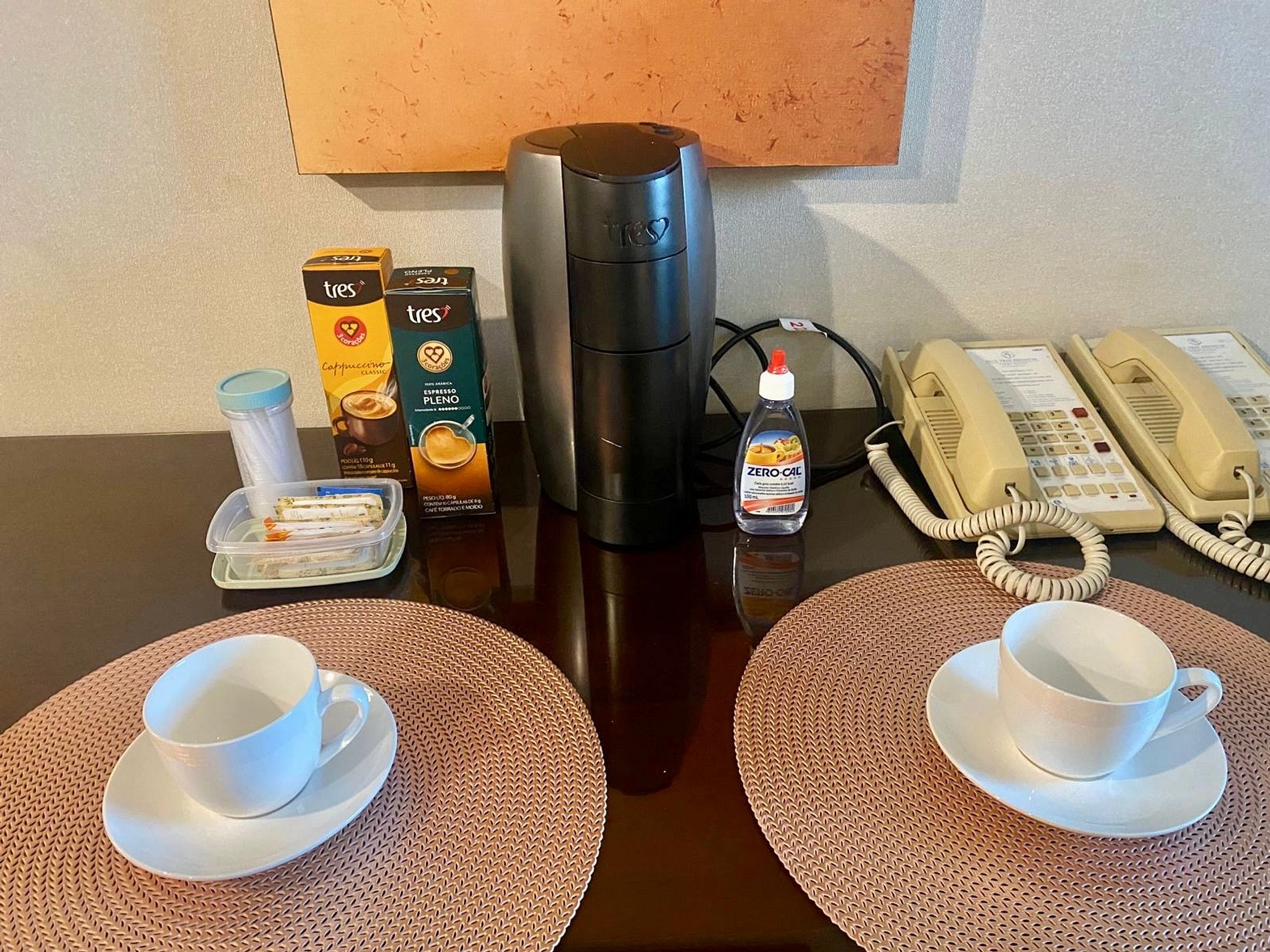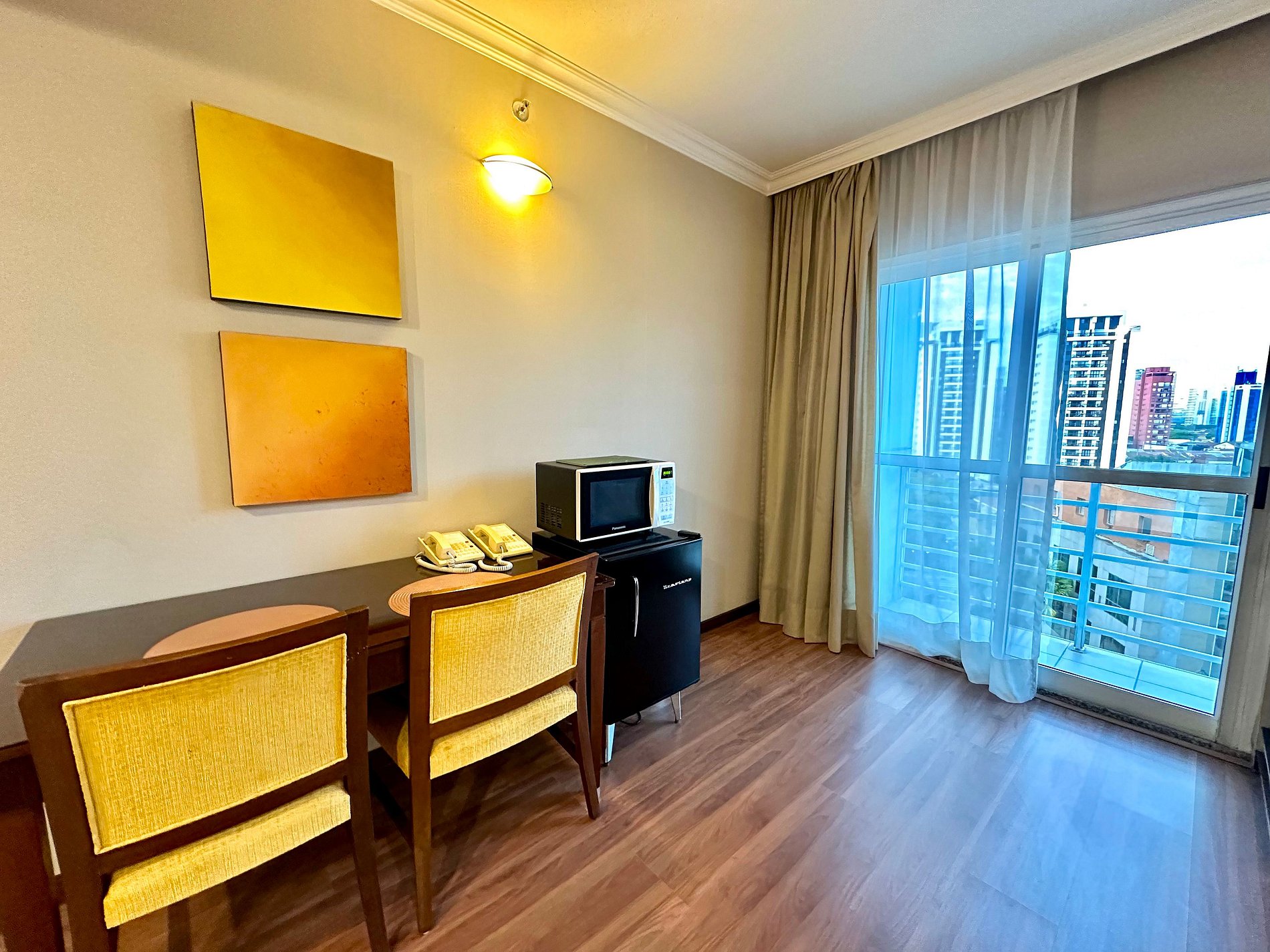 Frigobar e micro-ondas para refeições rápidas.