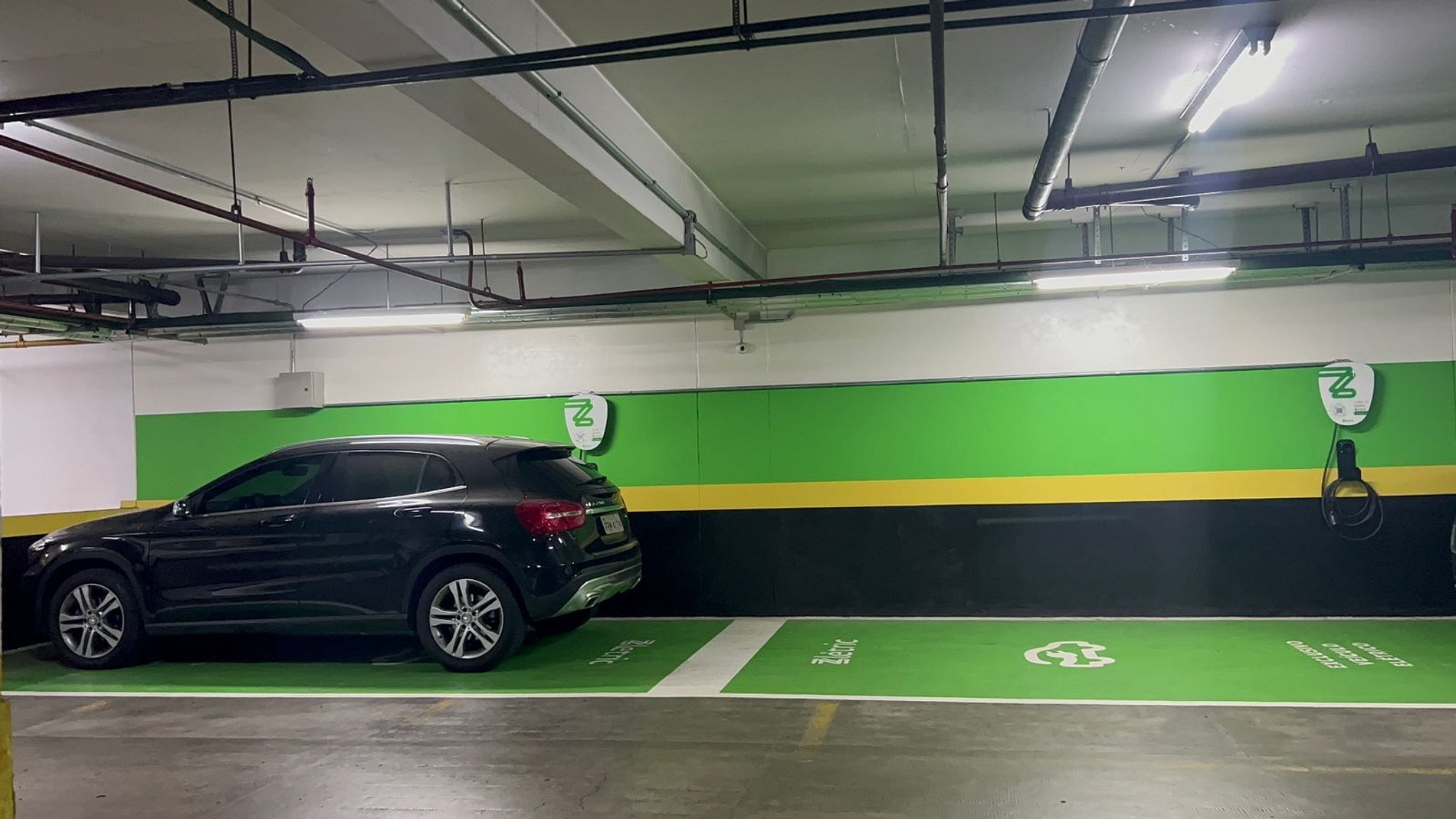 Estacionamento com carregador elétrico e manobrista.