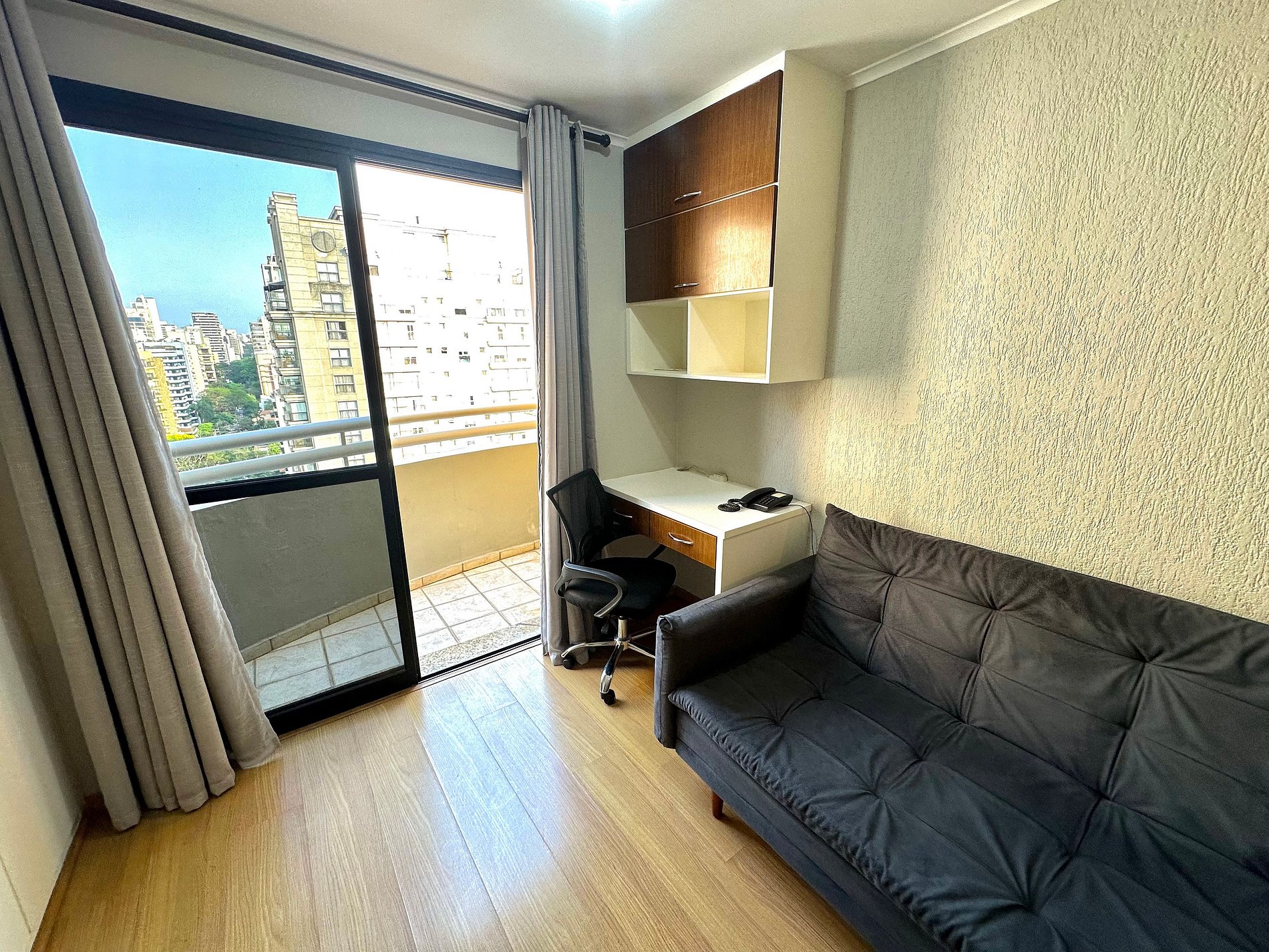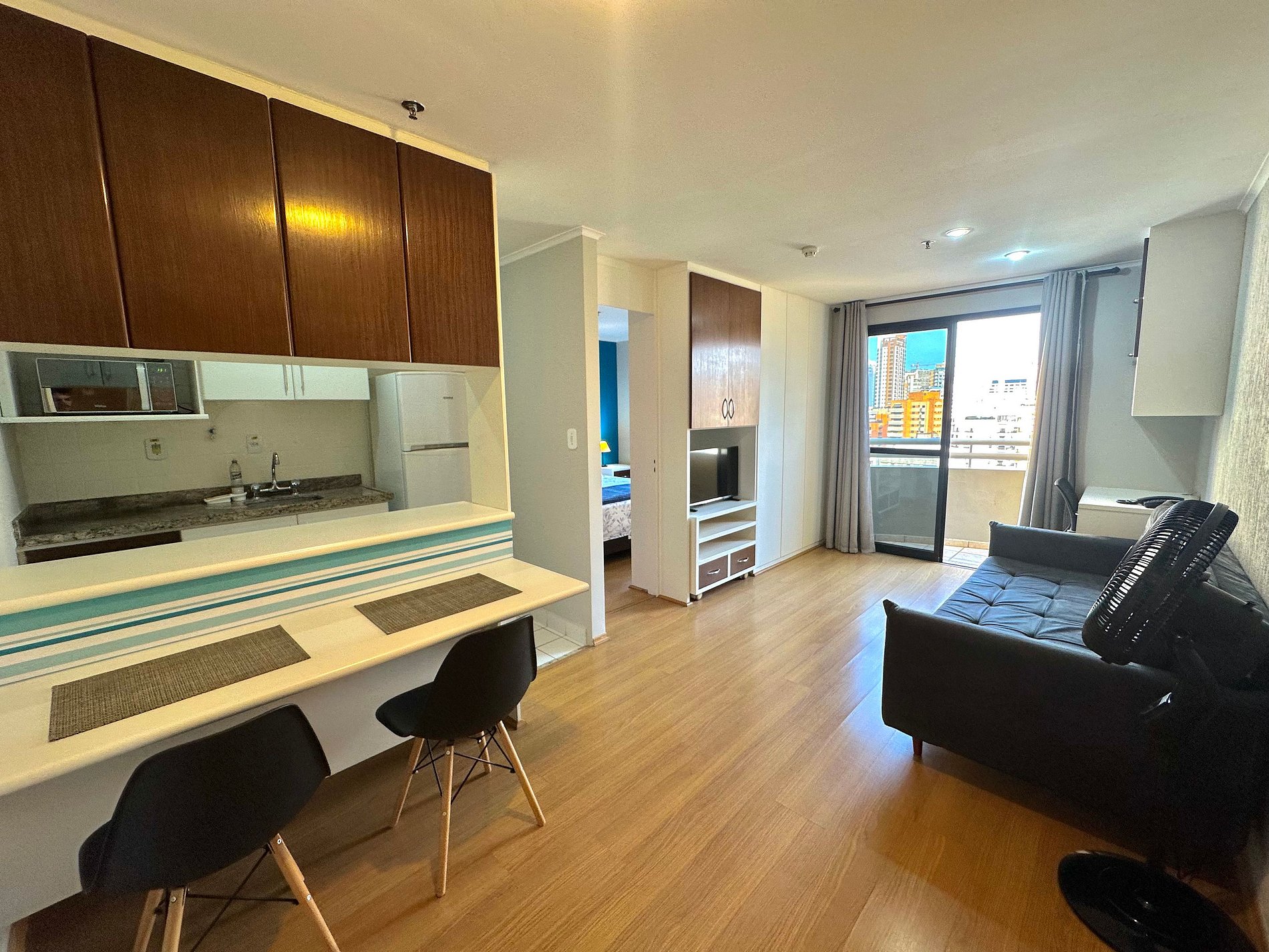 Flat totalmente mobiliado, Ar condicionado, TV Smart, Cozinha, sacada, 17° andar c/ vista, mesa de trabalho com cadeira de escritório, cama Queen (Nova), sofá cama casal, 01 suíte.